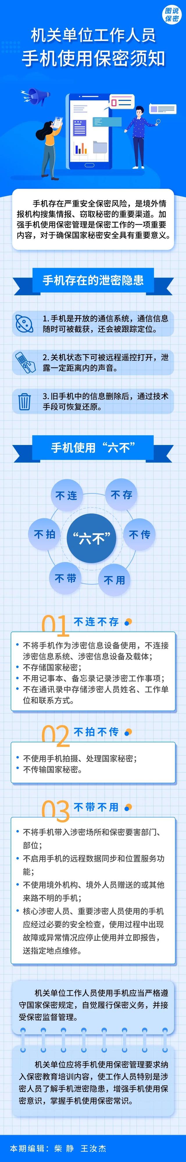 【確保國家秘密安全!機(jī)關(guān)單位工作人員手機(jī)使用保密須知】網(wǎng)絡(luò)安全為人民,網(wǎng)絡(luò)安全靠人民 手機(jī)存在泄密隱患!一圖讀懂機(jī)關(guān)單位人員手機(jī)使用保密須知。